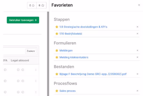 Je kunt nu formulieren, stappen, bestanden en processflows toevoegen aan je favorieten. Deze favorieten zijn rechtsboven te benaderen zodat je altijd naar iedere dataset toe kunt met maximaal 2 klikken. Dit is te gebruiken door iedere gebruikerstype.