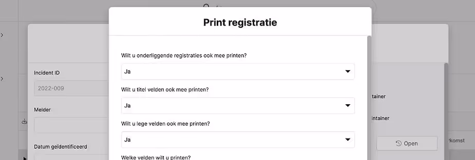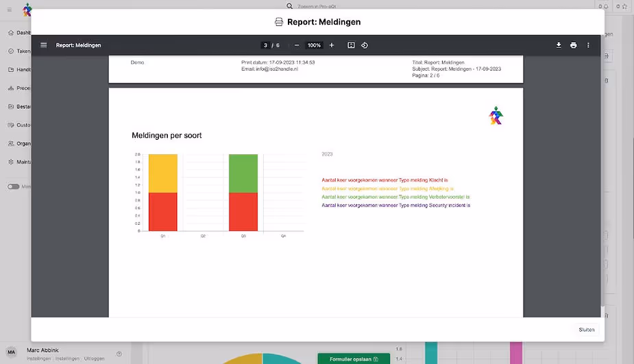 Je kunt nu een rapport uitdraaien van de grafieken in een formulier. Daarnaast kun je iedere grafiek nu een omschrijving geven die meekomt in het rapport. Hiermee kun je dus in één keer een rapportage overleggen van bijvoorbeeld de meldingen.Vanaf professional