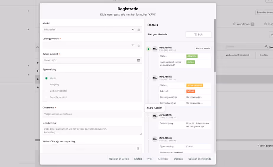 Iedere registratie heeft nu een eigen audittrail. Dit betekent dat iedere wijziging wordt opgeslagen en je terug in de tijd kunt, om te zien wie wat wanneer heeft aangepast. Je kunt daarnaast ook een oude versie herstellen.(Vanaf Professional en Uitgebreid)