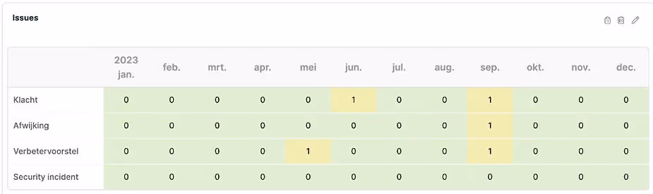 In het tegel dashboard is het nu mogelijk om formulier registraties te tonen in een grid. Je kunt dan zelf de velden voor de x-as en y-as selecteren. Zo kun je bijvoorbeeld op de x-as een meldingsdatum selecteren, als interval maandelijks kiezen en op de y-as het meldingstype. Je krijgt dan in één keer een helder overzicht. Hiermee kun je bijvoorbeeld ook mooi tonen of iedere maand door iedere medewerker een toolbox is bijgewoond. Tot slot kun je ook aangeven welk getal welke kleur krijgt in het overzicht.